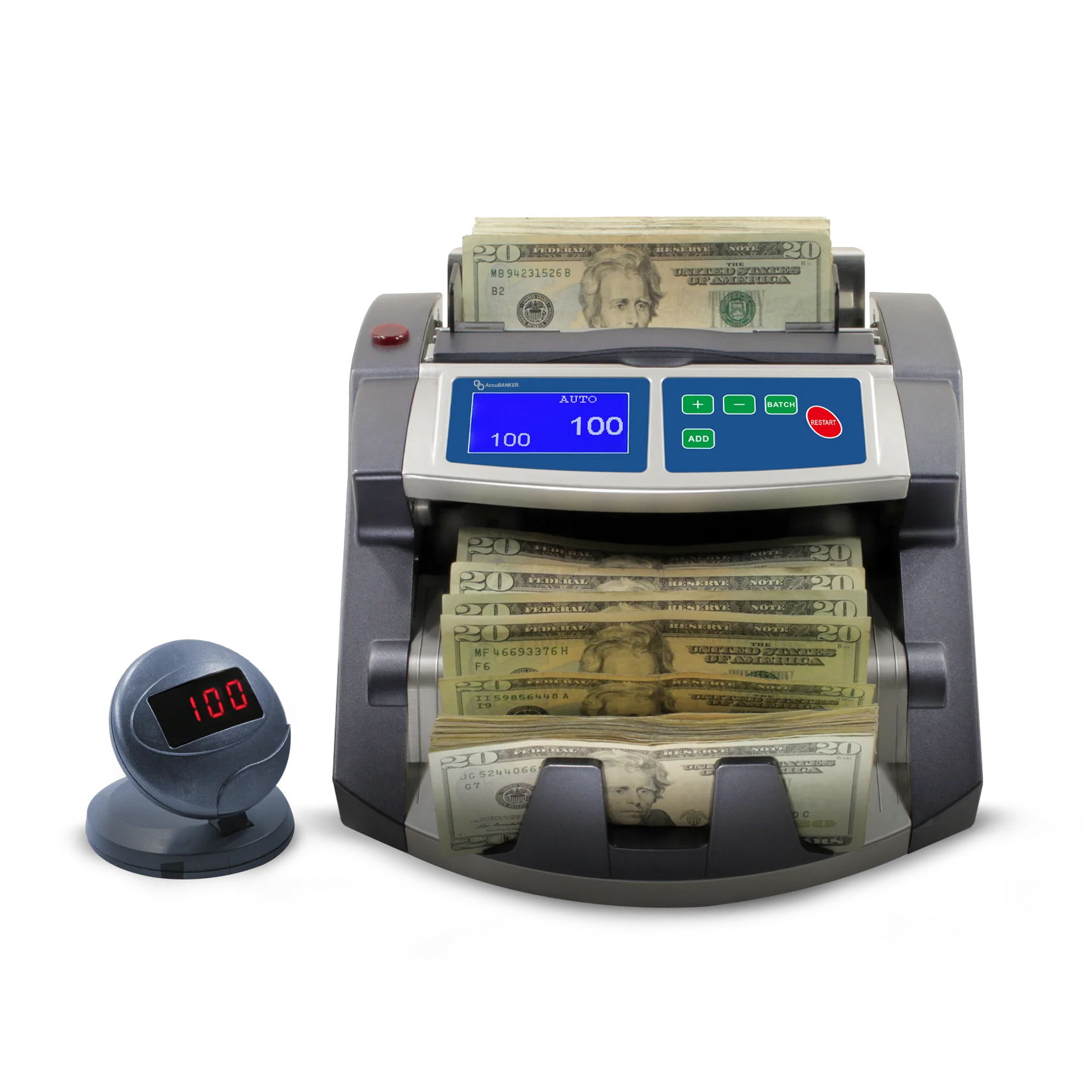 The AB1100 PLUS is perfect for small and medium-sized businesses. This money counter is equipped with an easy-to-read high-resolution LCD display that allows for counting, adding, and batching capabilities. The AB1100 PLUS has both automatic and manual start functions, as well as our patented emergency stop function. This machine comes equipped with an external display that allows the user to maintain accountability, security, and accuracy throughout each count.