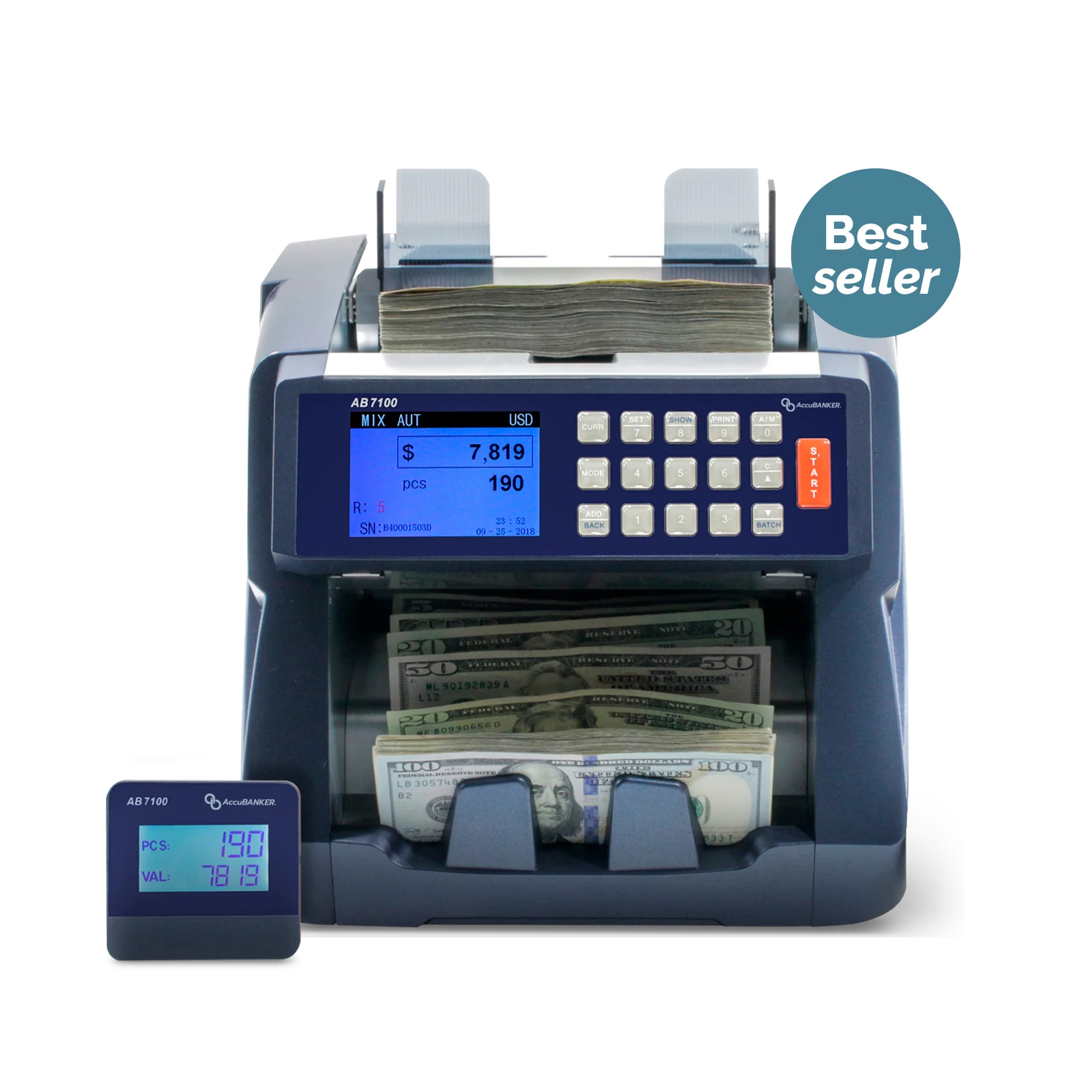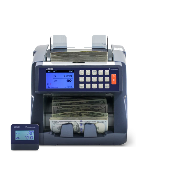The AB7100 is the perfect solution for a fast, accurate, and reliable bill counting process. The AB7100 is a mixed denomination value counter, meaning it can count a stack of mixed value bills, sort them, and provide a total value for the bills counted. It also enables you to have a detailed breakdown of totals by denomination. Not to mention that it comes equipped with 5 counterfeit detection methods that scan each bill while it is being counted for authenticity.