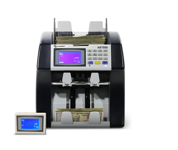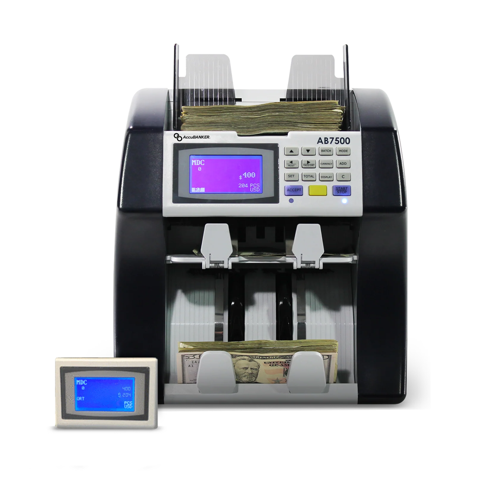 The AB7500 is the perfect solution for a fast, accurate, and reliable banknote counting process that can fit any business needs. The AB7500 is a multi-currency value counter that provides a detailed report of each count complete with a rejection pocket for a smooth and continuous count. It comes equipped with five modes of operation and five counterfeit detection methods. This unit is also compatible with our thermal printers, which allows you to print and keep records of each count (Printer sold separately). This machine quickly and accurately counts bills without having to presort them. The AB7500 can count a stack of mixed denomination bills and provides the user with a grand total breakdown by total value, number of pieces counted, and by denomination.