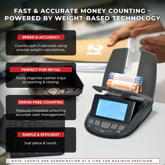 - Outstanding accuracy: count each denomination of bills and coins at once with an exact count and sum based on weight
